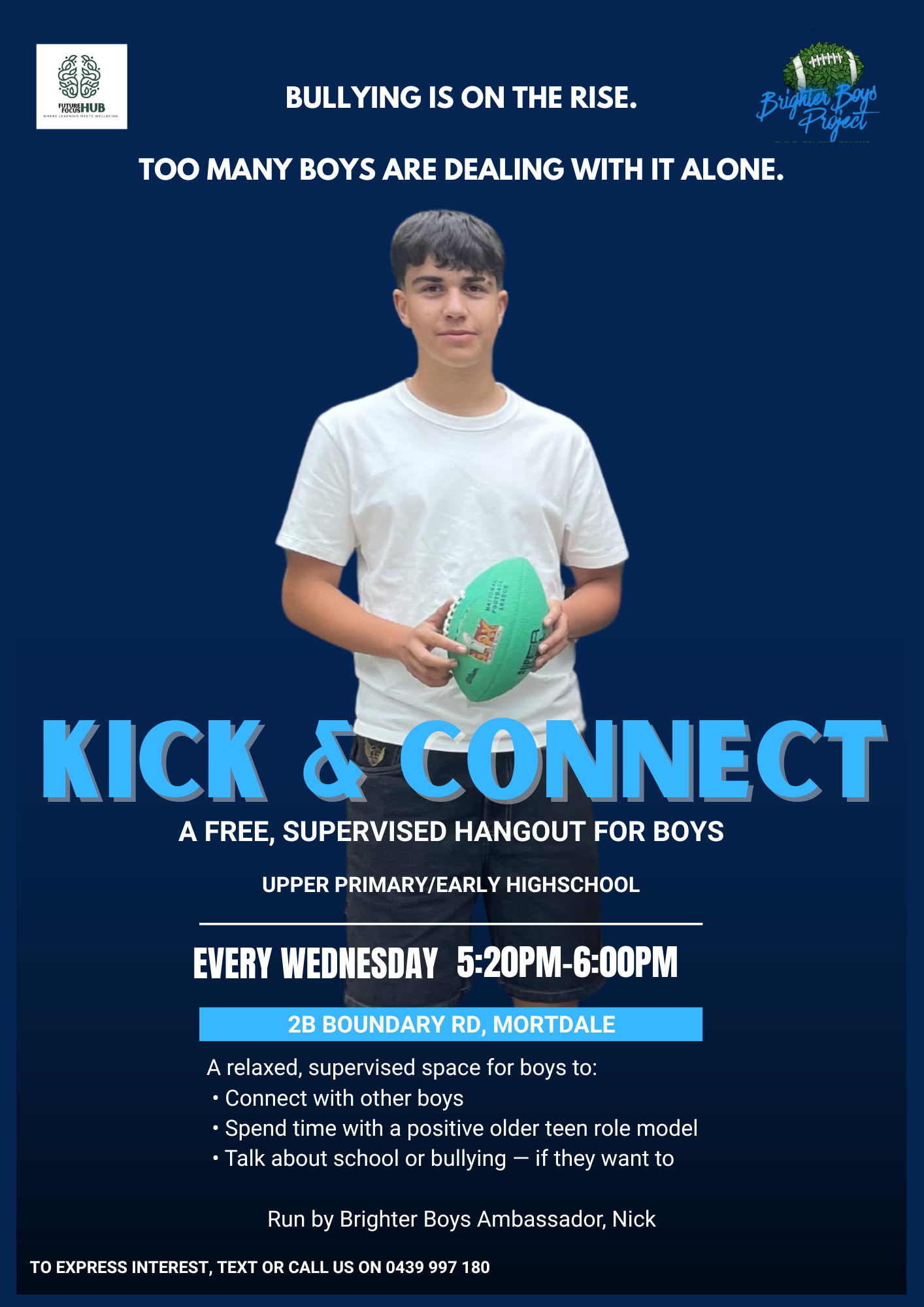 Come along to our FREE hangout for young boys seeking connection in a pressure-free environment. Every Wednesday at 5:20pm.